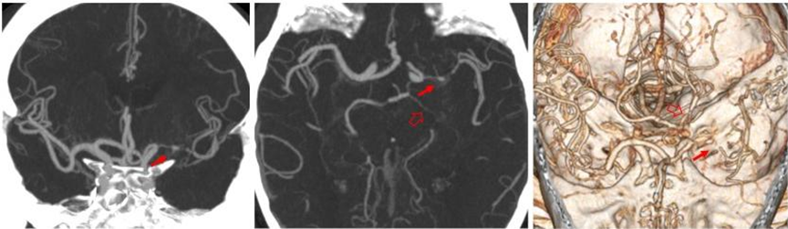 左侧大脑中动脉重度狭窄(红箭),左侧大脑后动脉重度狭窄(空心箭)。