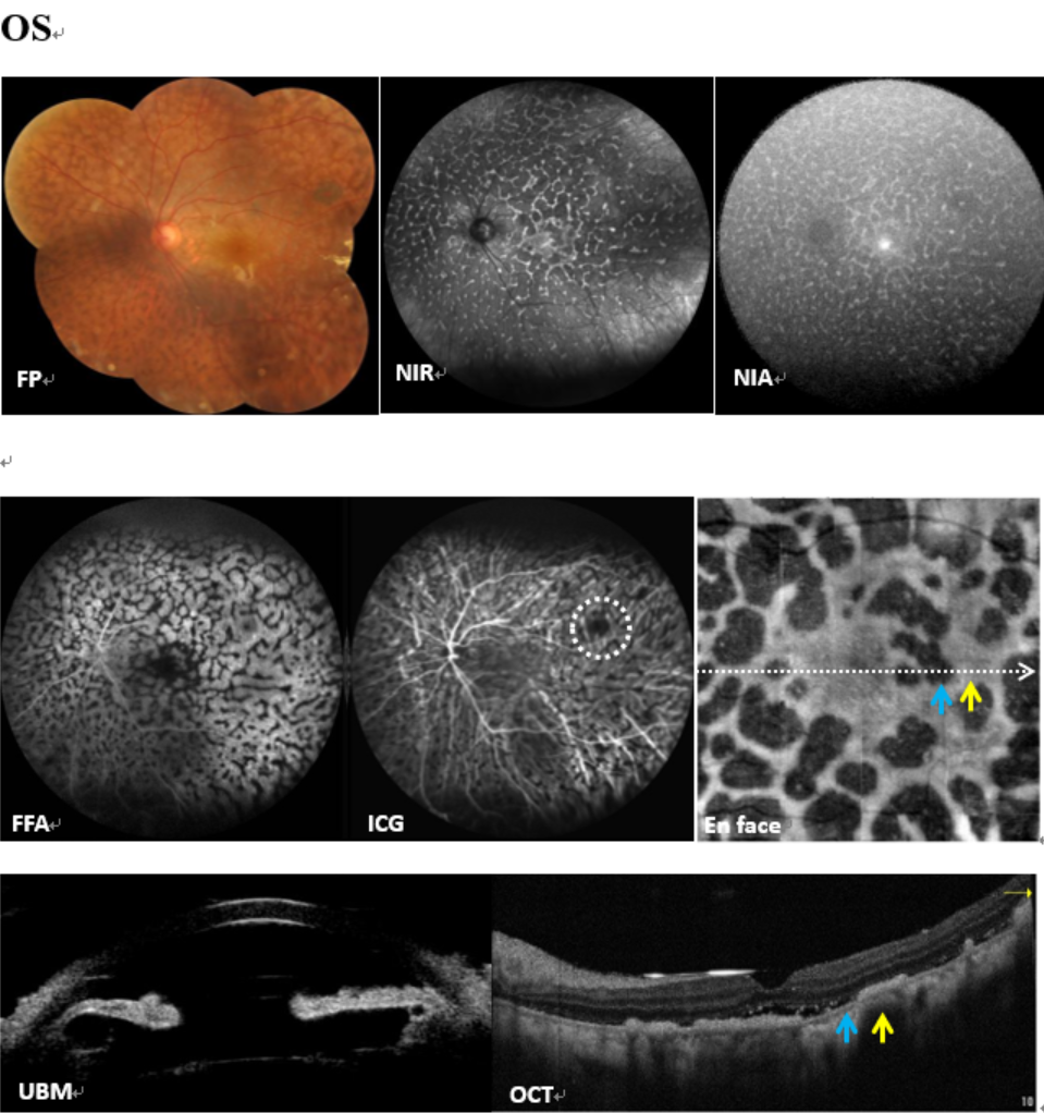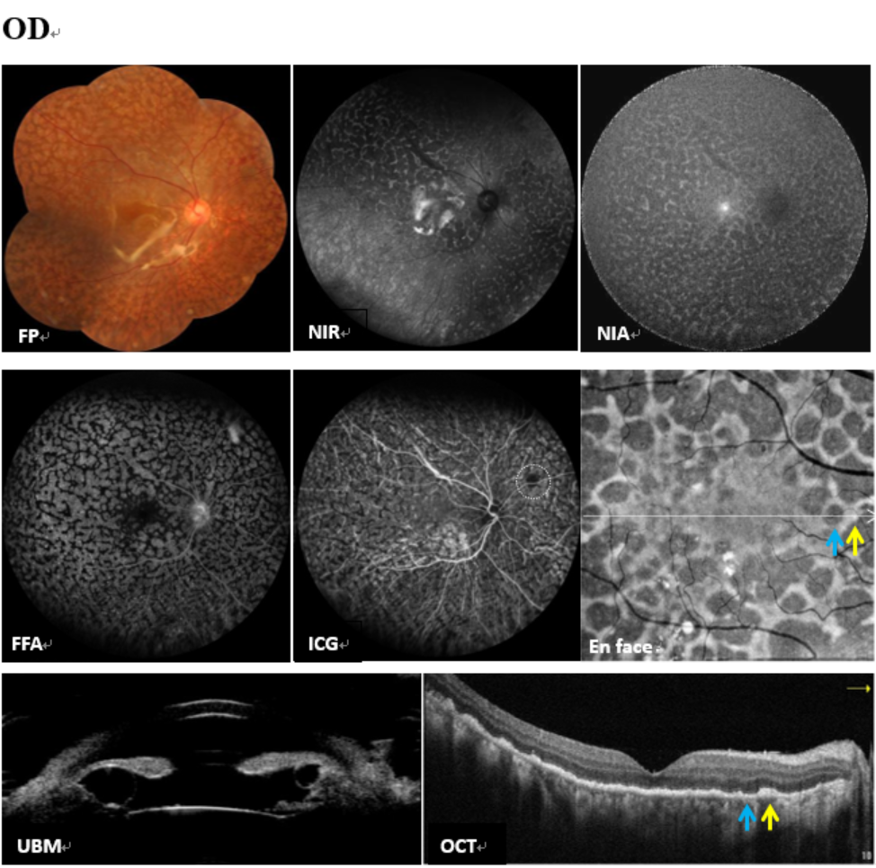 眼部检查:BCVA:右眼0.15,左眼0.12。眼压:右眼12.3mmHg,左眼12.7mmHg。双眼前节均无明显炎症反应。UBM显示双眼房角结构异常,睫状体弥漫性增厚及虹膜睫状体囊肿形成。眼底检查(如图):双眼全视网膜RPE水平散在致密类圆形、灰褐色斑片样病灶,病灶周围伴橘红色条纹状色素性隆起,呈“长颈鹿斑”样改变。眼底类圆形灰褐色斑片状病灶在OCT中显示为RPE及椭圆体带局限反射缺失(蓝箭头);FFA在相对应区域表现为透见荧光;NIA(近红外自发荧光)、NIR(眼底红外像)和en face OCT均呈类圆形暗区。病灶边缘橘红色条纹样病变在OCT中显示为RPE不规则增厚(黄箭头);FFA表现为遮蔽荧光;NIA、NIR和en face OCT均表现强自发荧光/反射。ICGA可清晰显示出脉络膜痣样的色素沉着(白圈)。
