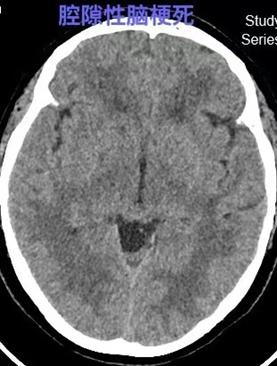 (6)腔隙性脑梗死:是脑梗死的一种,系穿支小动脉闭塞引起的深部脑组织较小面积的缺血性坏死,直径约5~15mm,主要原因是高血压和脑动脉粥样硬化,好发部位为基底节区和丘脑区,中老年人常见。