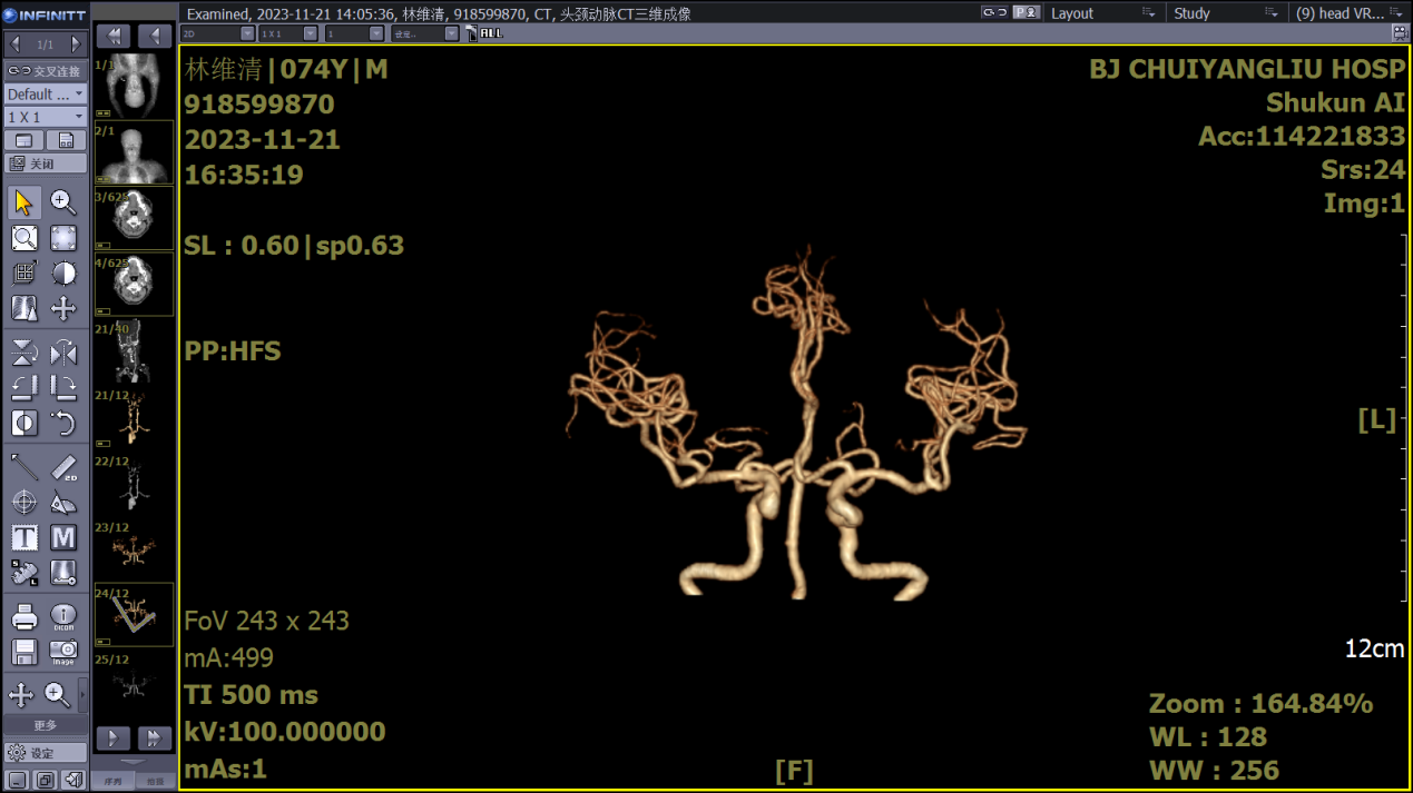 是一种介入检测方法,原理是显影剂被注入到血管里,因为X光穿不透显影剂,从而可显示出血管影像。CT血管成像(CTA)指静脉注射含碘造影剂后,经计算机对图像进行后处理,可以同时显示血管及骨性结构,清晰显示三维颅内血管系统,对狭窄或闭塞血管可提供重要的诊断依据。