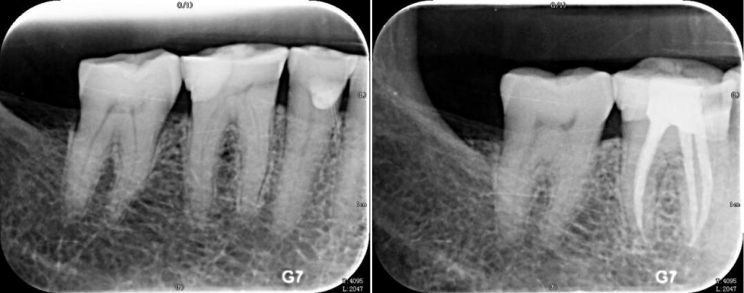 一般在做根管治疗前后,医生都会让患者去拍片,治疗前确定患牙龋坏范围、牙根情况;根管治疗结束后,拍摄根尖片确定填充效果,一般来说填充物会有一个非常致密的影像,且填充物距离根尖孔0.5~2 mm的距离为恰填,以后再次疼痛的概率会很低,此时也就可以放心去做牙冠修复了。