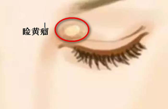 图中眼睑上的黄色凸起为睑黄瘤。它由胆固醇沉积引起,在中年妇女中的患病率最高,约一半患者会存在低密度脂蛋白或甘油三酯的升高。