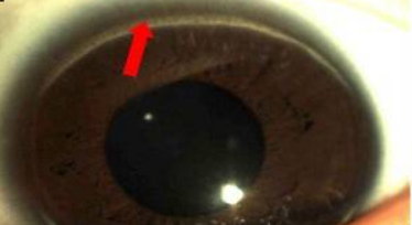 图中箭头指向的为角膜弧,是脂质沉积物,呈白色或灰色环状。一般而言,50岁以上人士的角膜弧通常为老年退行性病变(良性),但50岁以下人士的如果出现需要警惕血脂的异常。
