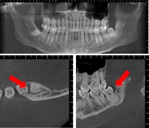 通过口腔专科检查及CBCT检查,发现患者的左下智齿近中阻生,其远中及近中可探及牙周深袋,左下第一磨牙黏膜转折处可见窦道,左上智齿阻生。根据病史及发病部位考虑,这名患者最终被诊断为智齿反复发炎导致的“牙源性皮瘘”。
