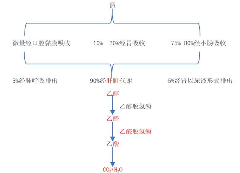 喝酒眼红是乙醛大量堆积的结果,和乙醇关系不大。一杯酒喝下肚后,首先会达到胃肠,被胃肠吸收后进入血液,再由血液循环转移给肝脏进行处理。一杯酒里90%左右的乙醇几乎都会在肝脏被分解掉。正常情况下,肝脏分解代谢酒精的过程中,若乙醛脱氢酶充足,则酒精会被及时分解掉,并不会出现脸红、眼红等情况。