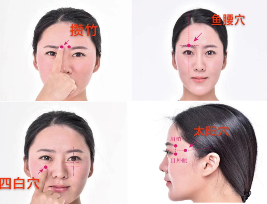 平时可按揉攒竹、鱼腰、太阳、四白等穴位,每穴约1~2分钟,有助于缓解眼部不适。