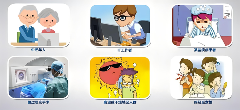 很多全身性疾病,尤其免疫系统或内分泌系统的疾病可能导致干眼,如糖尿病、痛风、严重的肝功能异常、Steven-Johnson综合征。另外,老年人、绝经期女性也容易患上干眼。