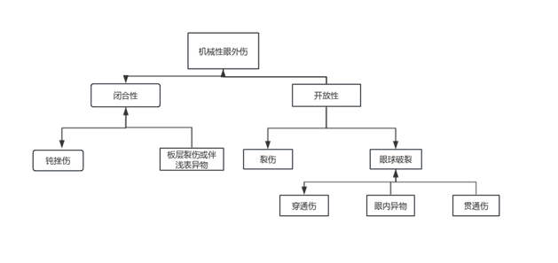 眼外伤有很多分类方法,按损伤程度可分为轻度、中度和重度。轻度损伤包括眼睑、结膜和角膜等浅表组织的擦伤和轻度酸碱烧伤;中度损伤包括眼睑、泪器和结膜的撕裂伤、角膜浅层异物和中度酸碱烧伤;重度损伤包括眼球穿通伤、眼内异物、眼球钝挫伤和重度酸碱烧伤。按照致病原因可分为机械性和非机械性两类,前者包括钝挫伤、穿通伤和异物伤等;后者包括热烧伤、化学伤和辐射伤等。其中,机械性眼外伤又可依据眼球壁的完整性分为开放性和闭合性。