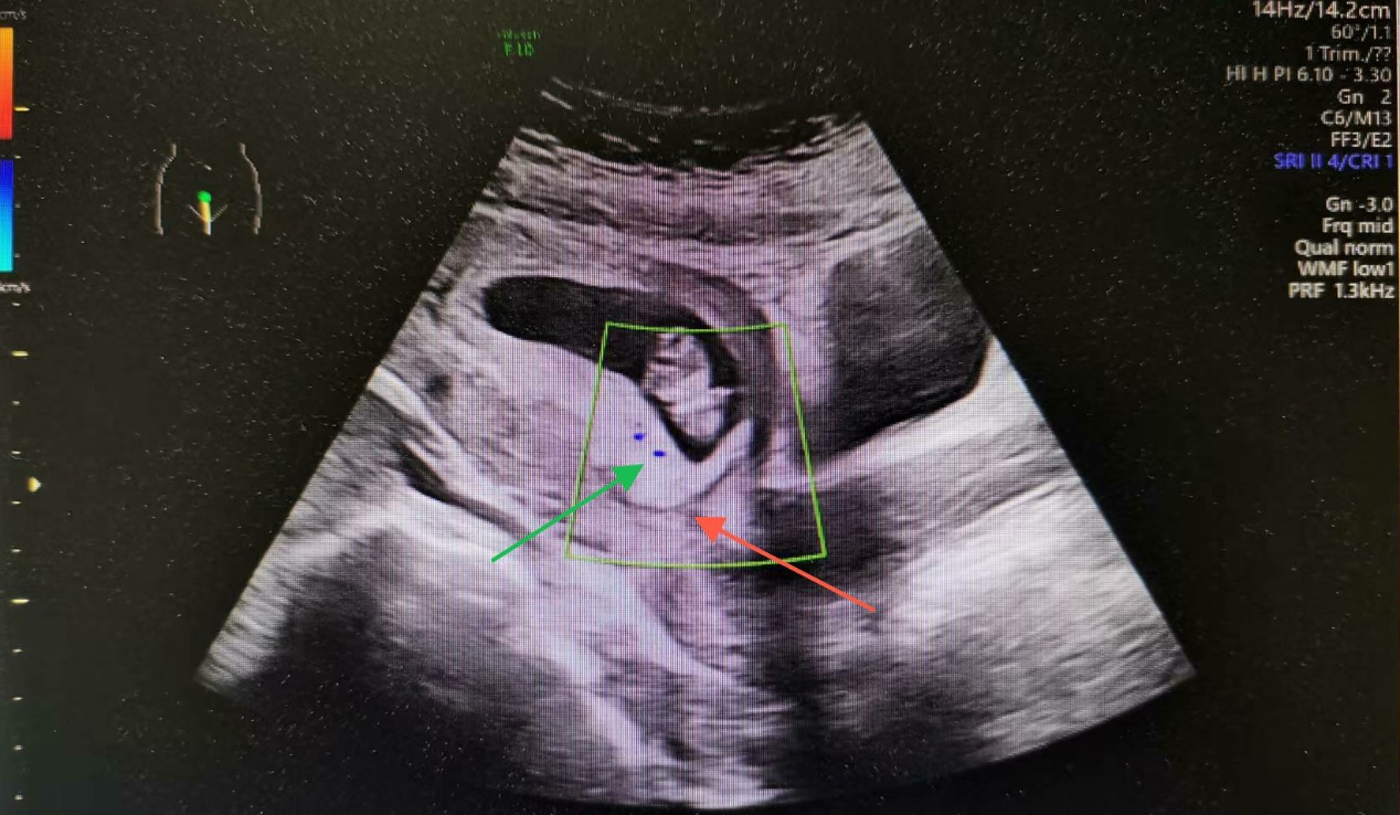 图1 绿色箭头:覆盖宫颈内口的后壁胎盘;红色箭头:宫颈内口