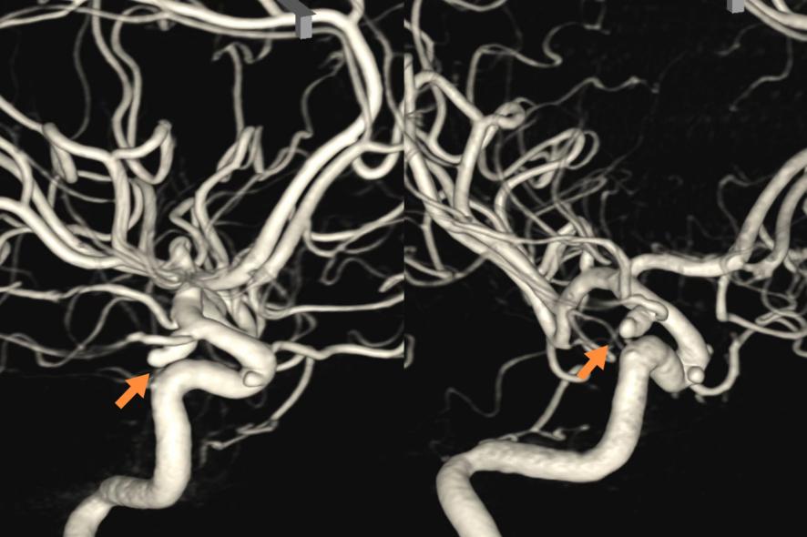 近日,北京市垂杨柳医院神经外科接诊了一位中年女性。该患者因5天前突发头痛,伴颈部,骶尾部不适被收入院治疗。入院当天患者突然出现左侧眼睑下垂,视物成双等情况,经神经外科医生刘磊检查,发现患者左侧眼睑不完全下垂,瞳孔左:右=4mm:3mm,对光反射存在,左侧眼球内收受限,其余方向活动正常。刘磊考虑患者左侧动眼神经不全麻痹,左侧后交通动脉瘤先兆破裂可能。紧急为患者加做头颅核磁,核磁血管成像证实为左侧后交通动脉瘤,大小约3*7mm,顶端有子瘤。结合患者病情,刘磊发现患者颅内左侧后交通动脉瘤短期内迅速增大,压迫动眼神经,已存在破裂迹象,且随时可能破裂出血而危及生命,需立即手术治疗。