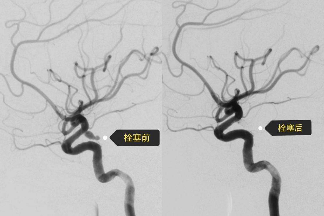 术中手术前后对比,动脉瘤致密栓塞,载瘤动脉通畅