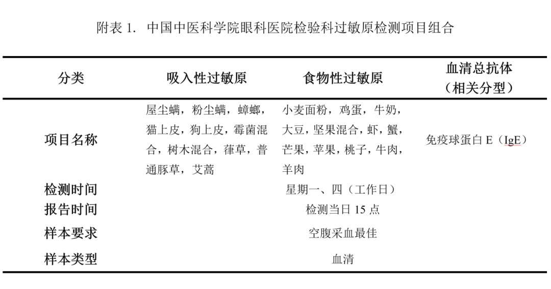 目前中国中医科学院眼科医院检验科开展的“过敏原检测项目组合”,由日常生活中常接触到的食物组和吸入组单点共计23项组成(见附表1),检测过程均采用革新技术--“免疫捕获法”,与传统定性检测方法相比,其在充分保证对低龄儿童检测灵敏度的同时,对各年龄阶段人群的过敏原筛查均可达到精准定量的检测目的。