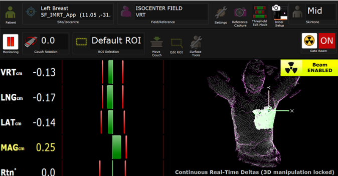 在放疗过程中,AlignRT系统能实时监测患者的体表轮廓,并与参考体表轮廓进行比对,显示出相对位移和偏转情况。这一过程的高效完成,为精准摆位提供了可靠保障。同时,该系统还能监测患者的位置信息,一旦发现患者体位偏差超过设定阈值,能及时中止加速器的束流,避免靶区漏照,确保放射治疗的精度和效果。