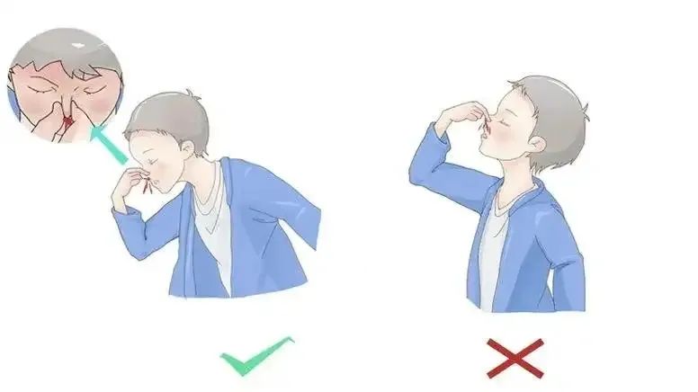 低头、身体前倾、张嘴呼吸,并用其食指和拇指捏住两侧鼻翼,向后上方按压;若有血液流进口腔应尽量吐出,以免咽下后刺激胃肠道,导致恶心、呕吐,禁止仰头压迫,以免鼻血流入呼吸道造成窒息。