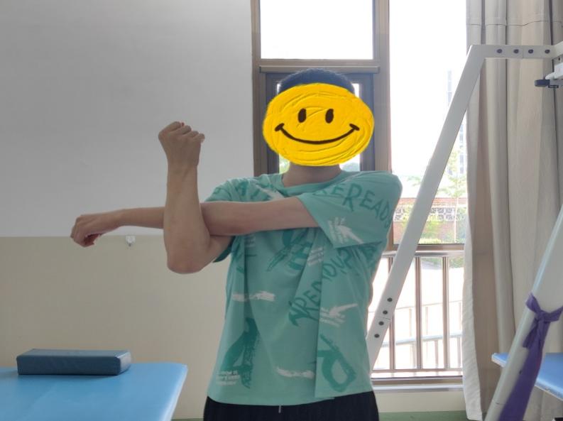 健侧手拉住患侧上肢向背侧压,拉伸肩关节后侧,有牵伸感位置保持30~60秒,重复3~5次。