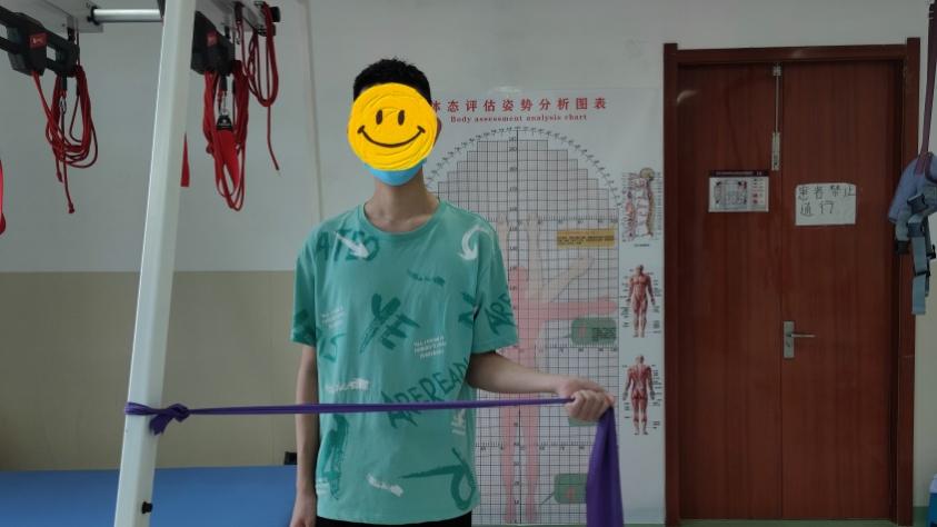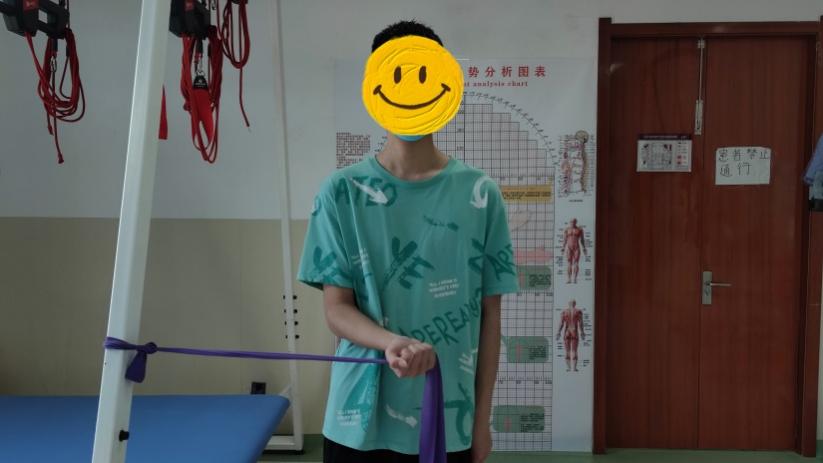 肘关节屈曲90°,夹紧体侧,慢慢将手臂往外旋转至最远位置1秒,再有控制地收回,10~15个/组,重复3组,训练时不能引起疼痛。