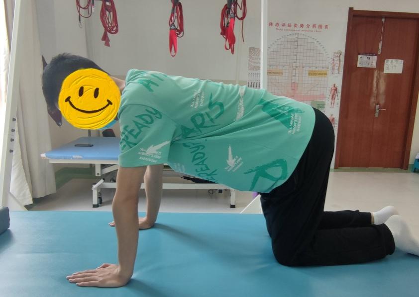 身体呈四点支撑姿势,确保肩—肘关节,髋—膝关节垂直。脊柱中立位,主动将双手按压于床上,不应看到肩胛骨任何内收、上抬和翼状突起。逐渐增加动作保持时间,如果能维持正确姿势30秒,便可尝试举起一侧手臂的动态练习。
