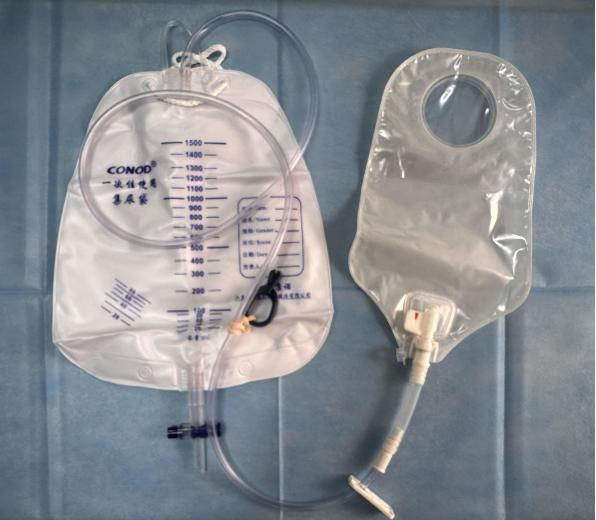 根据回肠造口术后早期排泄物呈水样便且量较多、次数频密的特点,可以选择一件式/两件式具有抗返流设计特点的泌尿造口袋(图1)并连接床边尿袋(图2),这种方法可以充分引流排泄物,减少排泄物逆流,方便和有效地管理患者的排泄污物,减少排泄污物对伤口的刺激和感染的风险,避免排泄污物积聚在造口根部伤口周围并发症的发生,促进伤口愈合。
