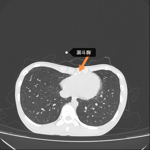 临床表现[3]:婴儿期漏斗胸压迫症状较轻者常未被注意。患儿常体形瘦弱,不好动,易患上呼吸道感染,活动能力受限制,活动后出现心慌、气短和呼吸困难。体征除胸廓畸形外,常有轻度驼背、腹部凸出等特殊体型。X线侧位胸片可见下段胸骨向后凹陷,与脊柱间距离缩短,CT图凹陷更为确切清晰。