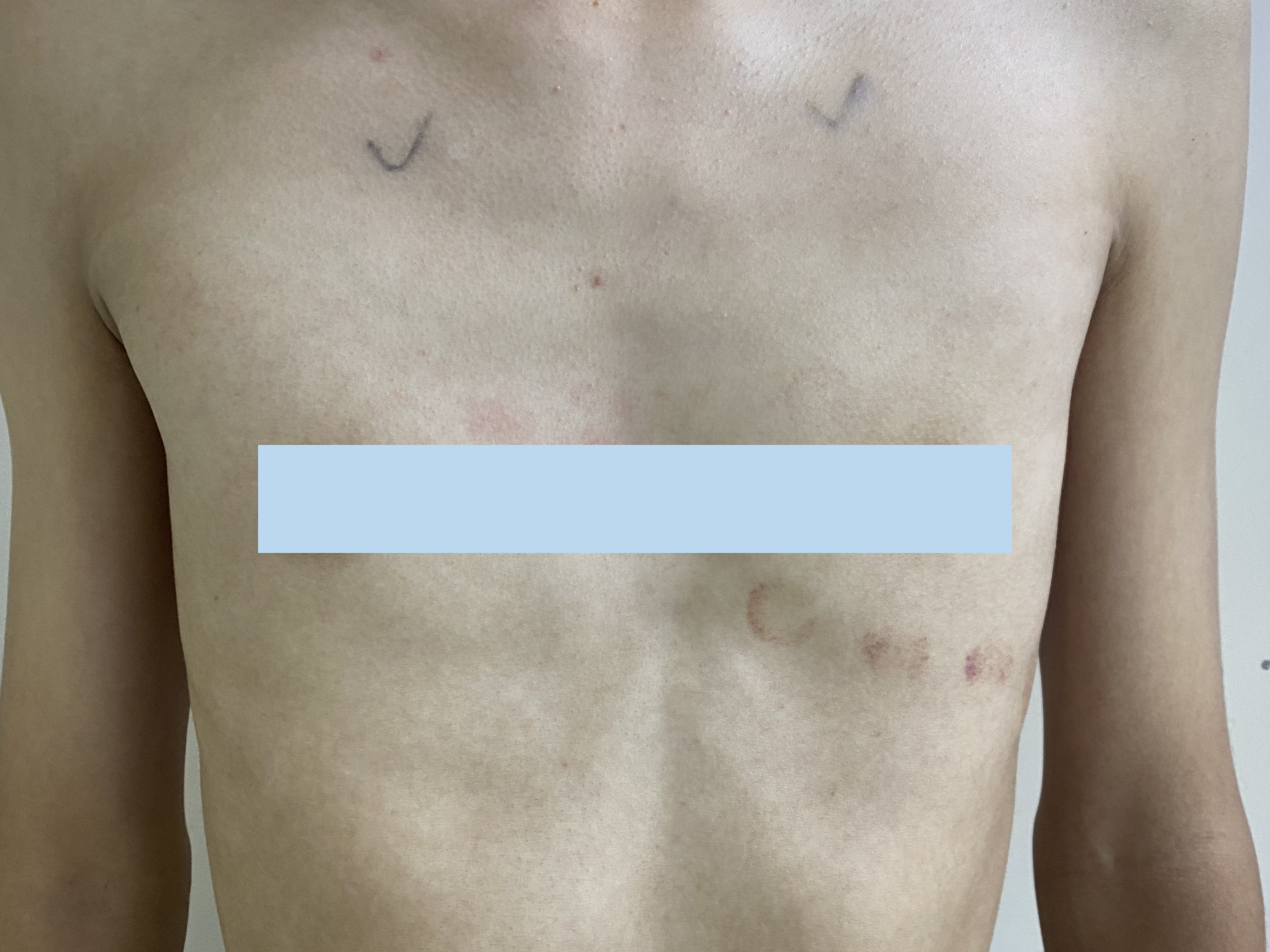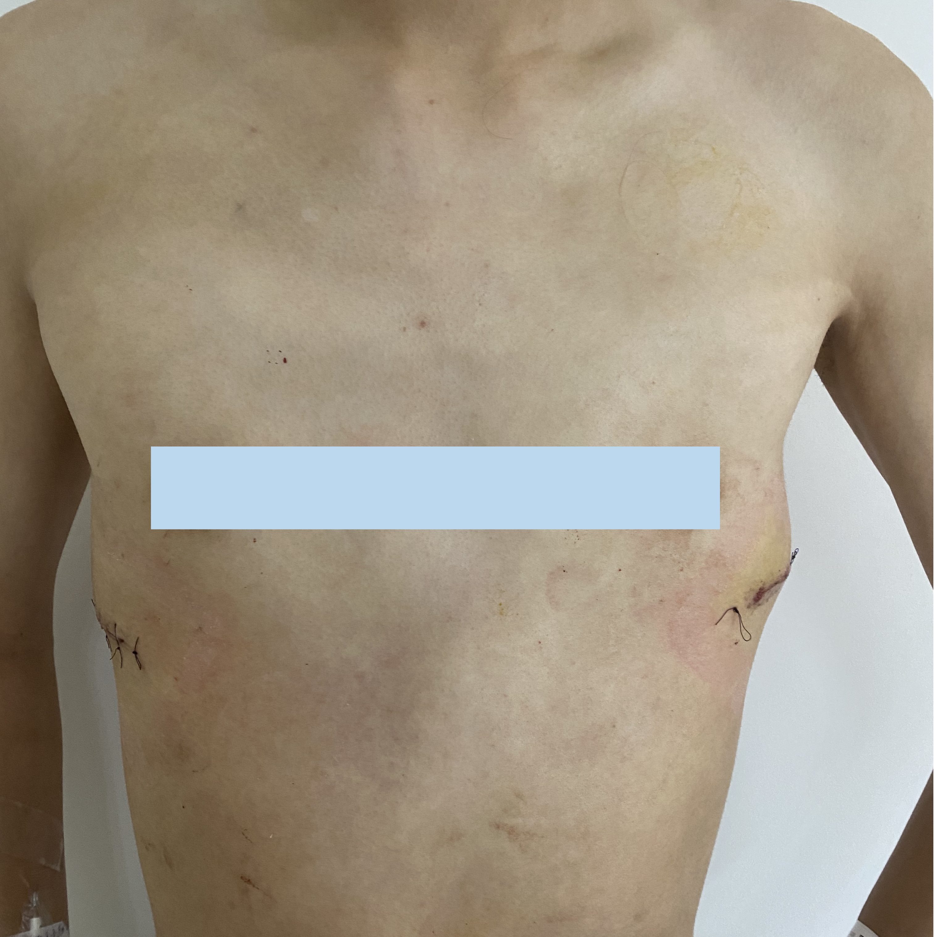 胸外科主任崔健在接诊后,为患者安排查体及影像学检查(图1、图2)。通过检查,发现患者为漏斗胸,诊断明确。在充分分析患者病情的基础上,崔健认为患者符合Nuss手术适应症,在严格进行术前评估及准备,并征求患者及家属的意见后,崔健和胸外科医疗团队为患者实施了Nuss手术,即微创漏斗胸矫正术。术后胸廓矫正满意(图3),患者于术后1周顺利出院。