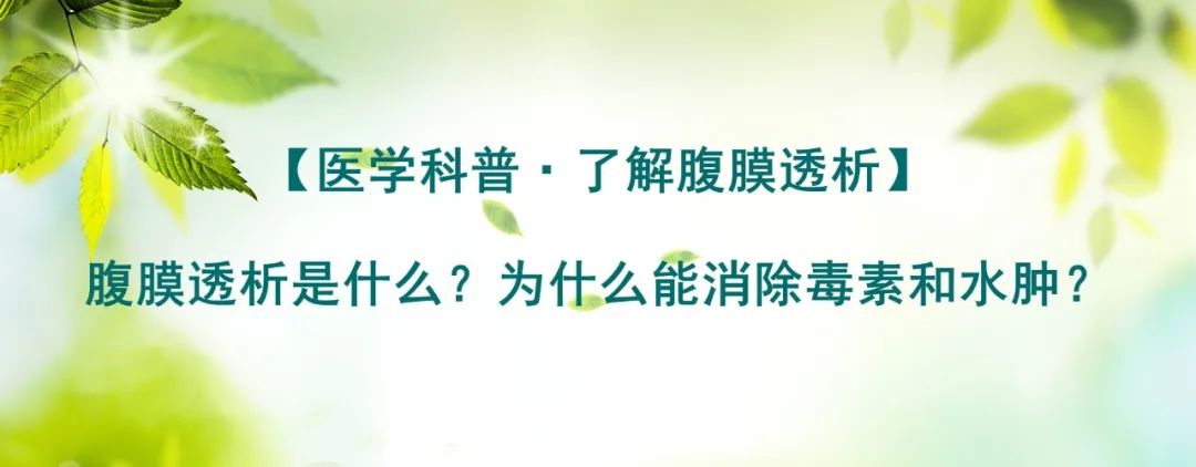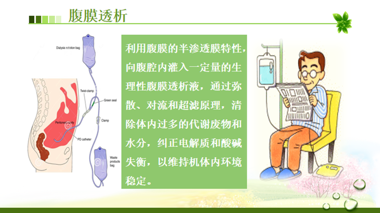 沿着腹壁内侧和内脏的表面覆盖了一层很薄的膜,称为腹膜。腹膜是半透膜,允许尿素氮、肌酐、水分等物质透过,可将蛋白质等大分子物质留在体内。腹膜透析就是利用这层膜来达到治疗目的,清除体内毒素和多余的水分,反复进行透析液的注入、存储和引流的循环过程,就是腹膜透析。
