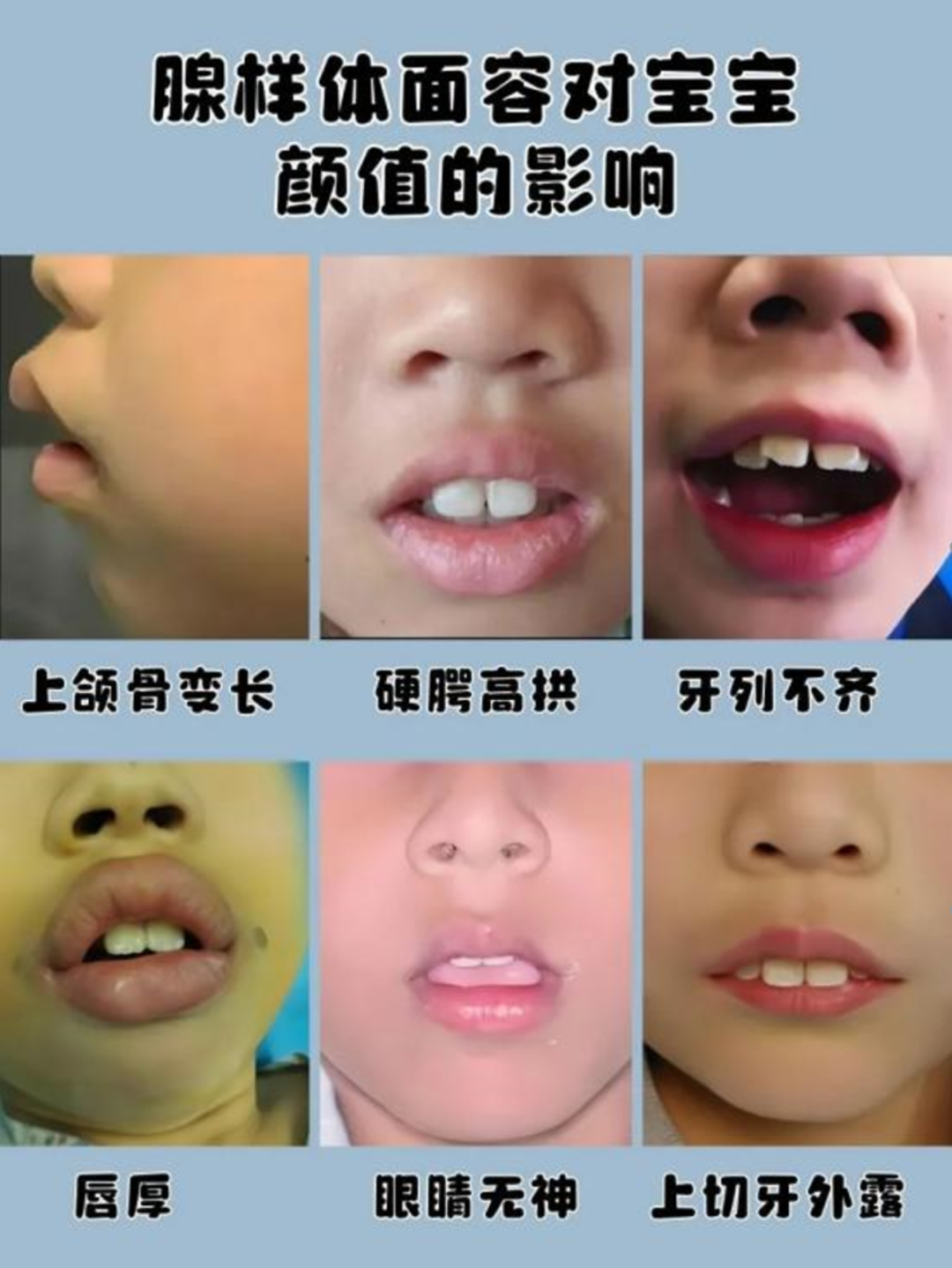 在孩子的成长过程中,家长们总是关注他们的身体健康和发育状况。然而,有一种常见的问题——腺样体肥大,却往往被忽视。它不仅影响着孩子们的呼吸、睡眠质量,还可能导致面部发育异常,形成所谓的“腺样体面容”。今天我将从腺样体面容开始详细讲解这一疾病,让家长重新了解腺样体肥大。首先介绍一下家长最担心出现的腺样体面容,但是什么样的面容才是腺样体面容呢?这种面容表现为上颌骨变长,下颌骨后缩,腭盖高拱,牙列不齐,上切牙突出,嘴唇变厚,缺乏面部表情,面容呆滞,看起来有点呆傻,故也可以称为"痴呆面容"。