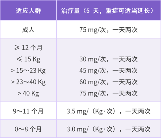 目前我国批准上市的奥司他韦有颗粒及胶囊剂型。奥司他韦治疗流感的用法用量见下表: