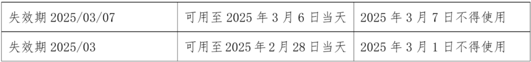 若失效期标注到日,表示可以用至失效期前一日;若失效期标注到月,表示可以用至前一个月月底。