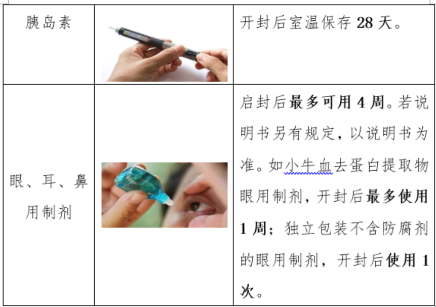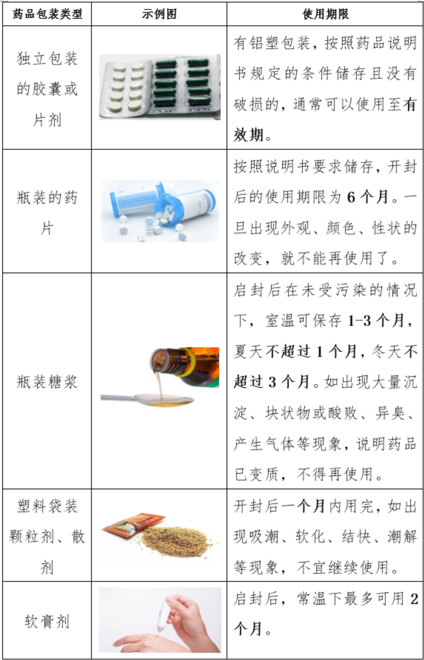 药品一旦启封,空气中的氧气和水分会影响到药品的理化性质,有效期也随之发生变化,此时称为“药品使用期”。不同包装、不同质地、不同剂型的药品在开封后使用期限也不同。