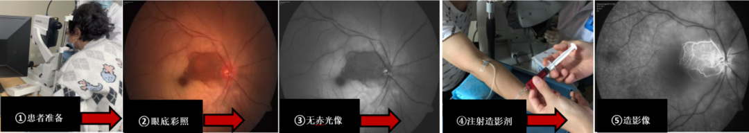 4、拍摄图像:医生会用特殊相机在不同时间点、不同方位拍摄多张眼底图像,总计时长约10-30分钟。造影过程中可能会出现一过性恶心、呕吐,请不要紧张,深呼吸,一般均可自行缓解。