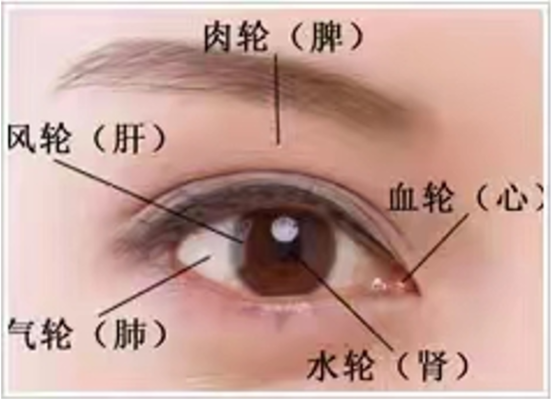 两眼内外眦也就是两个眼角的血络属心,称为“血轮”;黑睛即黑眼珠部分属肝,称为“风轮”;白睛也就是我们常说的眼白部分属肺,称为“气轮”;瞳仁属肾,称为“水轮”;上下眼胞属脾,称为“肉轮”。