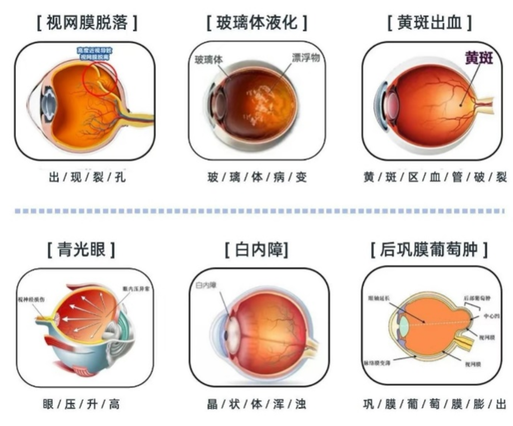 高度近视患者的眼轴长度远超正常值(≥26mm),导致视网膜、脉络膜持续变薄,进而导致眼底出现一系列并发症,如后巩膜葡萄肿、黄斑萎缩、新生血管、视网膜劈裂、变性裂孔网脱、青光眼、白内障等,而这些并发症是导致高度近视视力受损的关键。