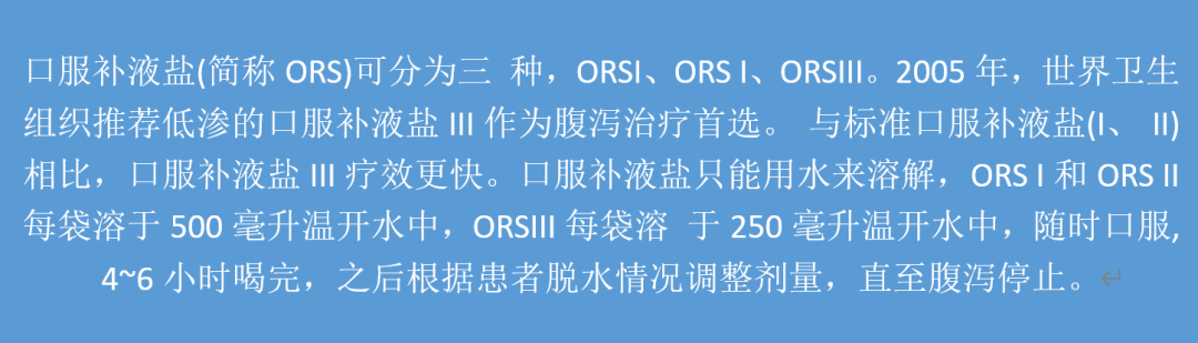 用于治疗和预防急、慢性腹泻造成的轻度脱水。腹泻导致人体从肠道丢失大量液体和电解质,如果脱水严重,可能会引发肾功能衰竭,甚至导致死亡。所以,在无频繁呕吐、可饮水及进食的情况下,最好及时补充口服补液盐或多喝水。口服补液盐制剂由葡萄糖和人体必需的钠盐、钾盐等组成,可以补充因腹泻丢失的水分及重要盐分,调节水和电解质的平衡。
