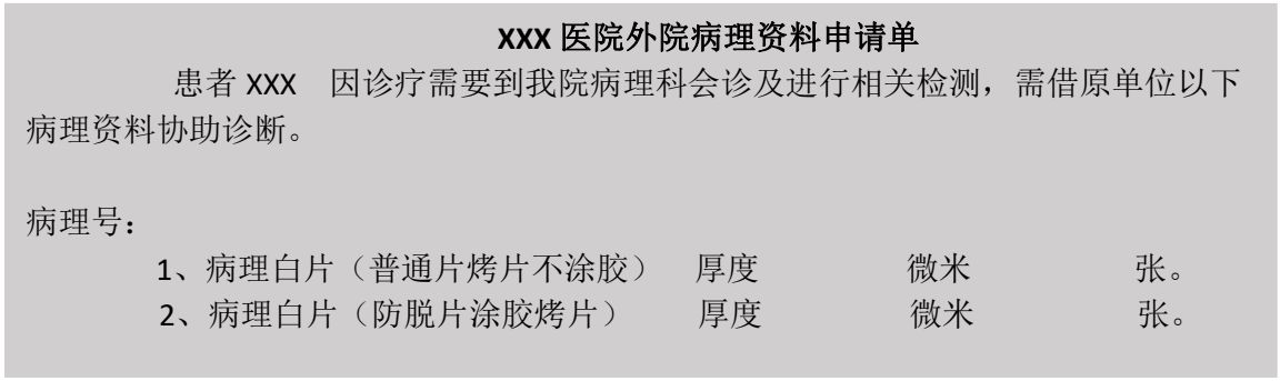 备注:必须确认病理号及小号,例如患者病理号包括25011-1、25011-2、25011-3,则需要明确到是-1或-2或-3;如果不能明确,可以借阅病理切片到检测单位复核切片确定病理号。必要时留下对方联系方式,方便沟通切片细节。