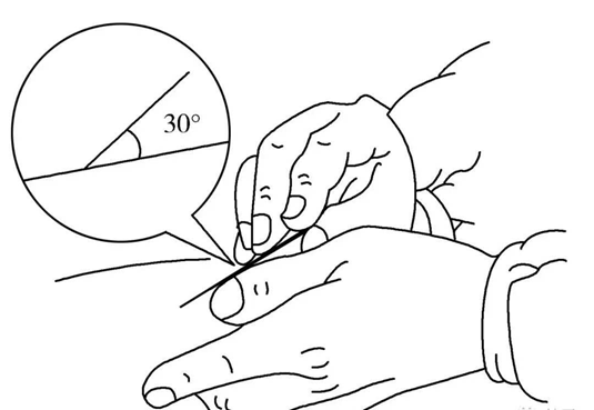 以30°角斜刺入皮下,针体宛如"躺"在皮肤下