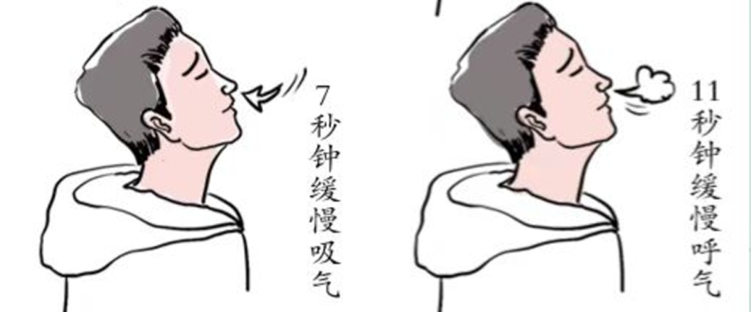日常练习腹式呼吸(吸气鼓腹,呼气收腹)、缓慢深长呼吸(吸气4秒,屏气2秒,呼气6秒)。