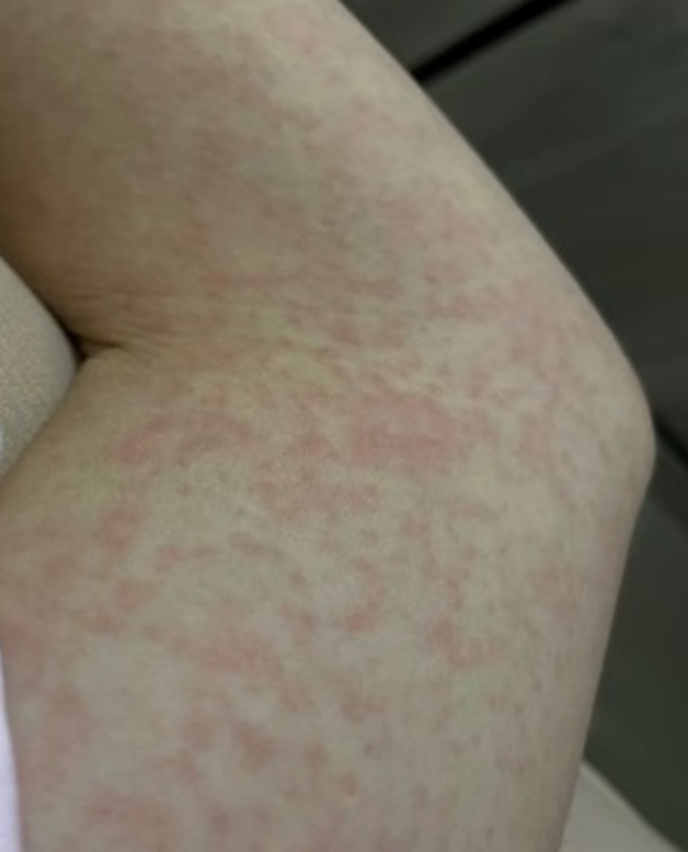 皮疹(类似登革热,躯干或四肢出现红斑):通常在发病后2-5天后出现,半数以上病例在躯干、四肢伸侧、手掌和足底出现红色斑丘疹或紫癜,疹间皮肤多为正常,部分伴有瘙痒感,数天后消退,可伴脱屑。