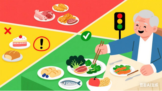 餐桌上不妨记住“三色交通灯”原则:红色警戒区(严格限制动物内脏、肥肉等)、黄色警示区(谨慎选择精制碳水化合物)、绿色畅行区(可放心食用深色蔬菜等)。