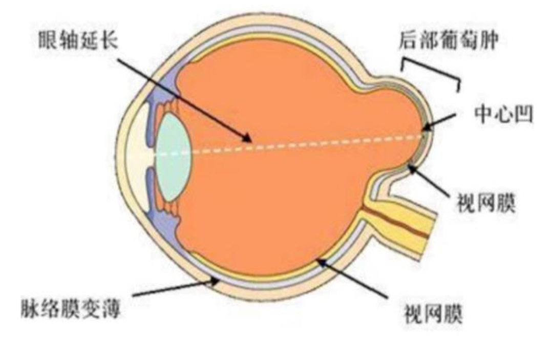 随着眼轴的不断延长,眼球就像气球一样不断变大,尤其是眼球底部的厚度就会变得薄如蝉翼,较容易发生巩膜后葡萄肿。患者的近视度数越高,其发生率就越高,患者通常伴有视力减退、眼痛等症状,严重者视力会丧失。