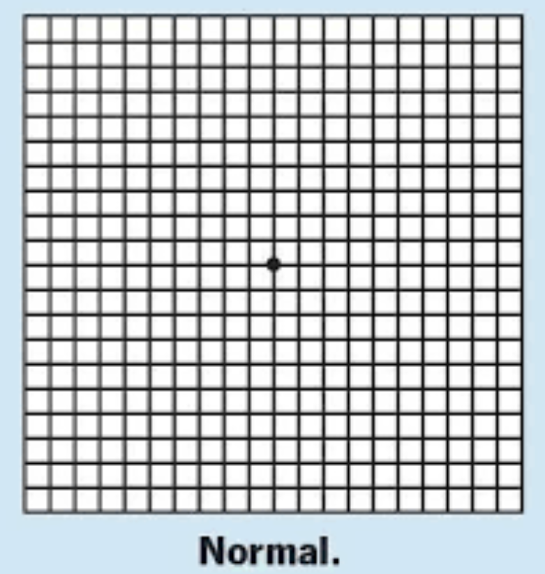 这是一个简单的自查工具。平时可以打印一张放在家里。如果发现线条变弯、格子变大变小,请立即就医!这是黄斑出现问题的典型信号。