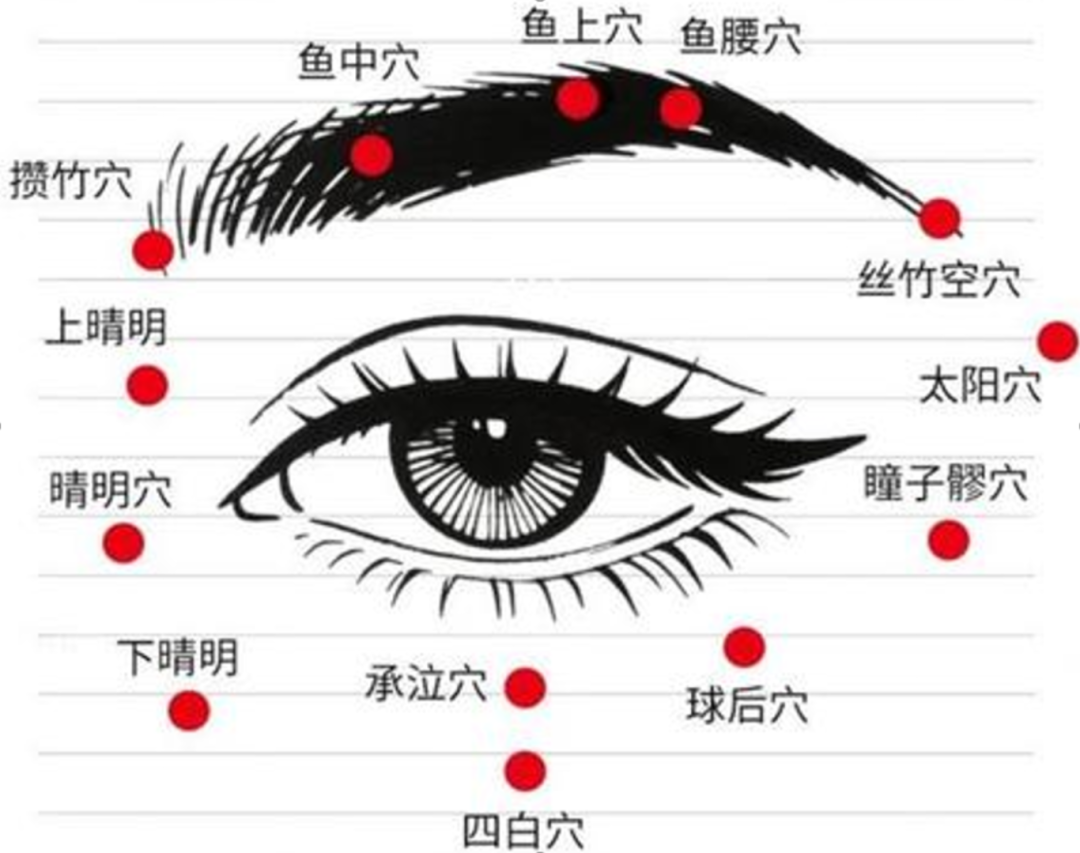 按压四白穴(瞳孔直下,眶下孔凹陷处):按之能改善眼部血液循环。