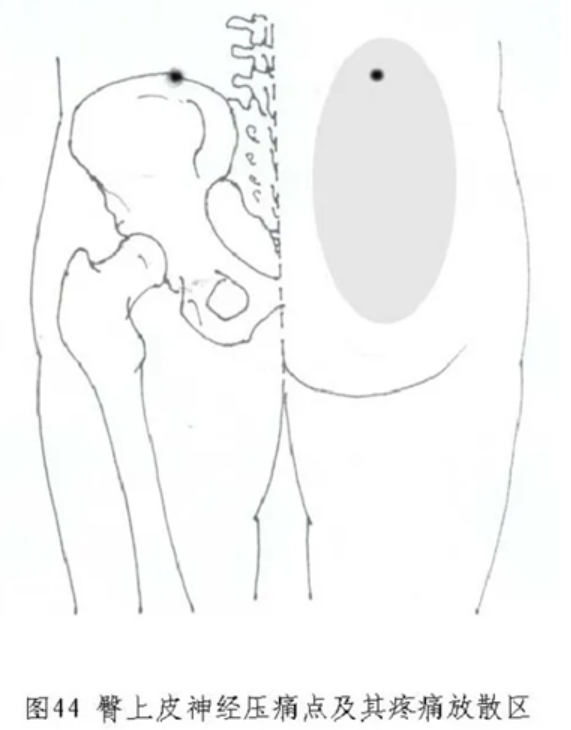 若按(1)处疼痛,还引发腿麻,提示可能是腰突;按(2)处疼痛,并且摸到了“条索状硬结”,则提示可能是臀上皮神经卡压;按(3)处疼痛,并且腿部伴有有明显的酸胀感,提示可能是梨状肌综合征。