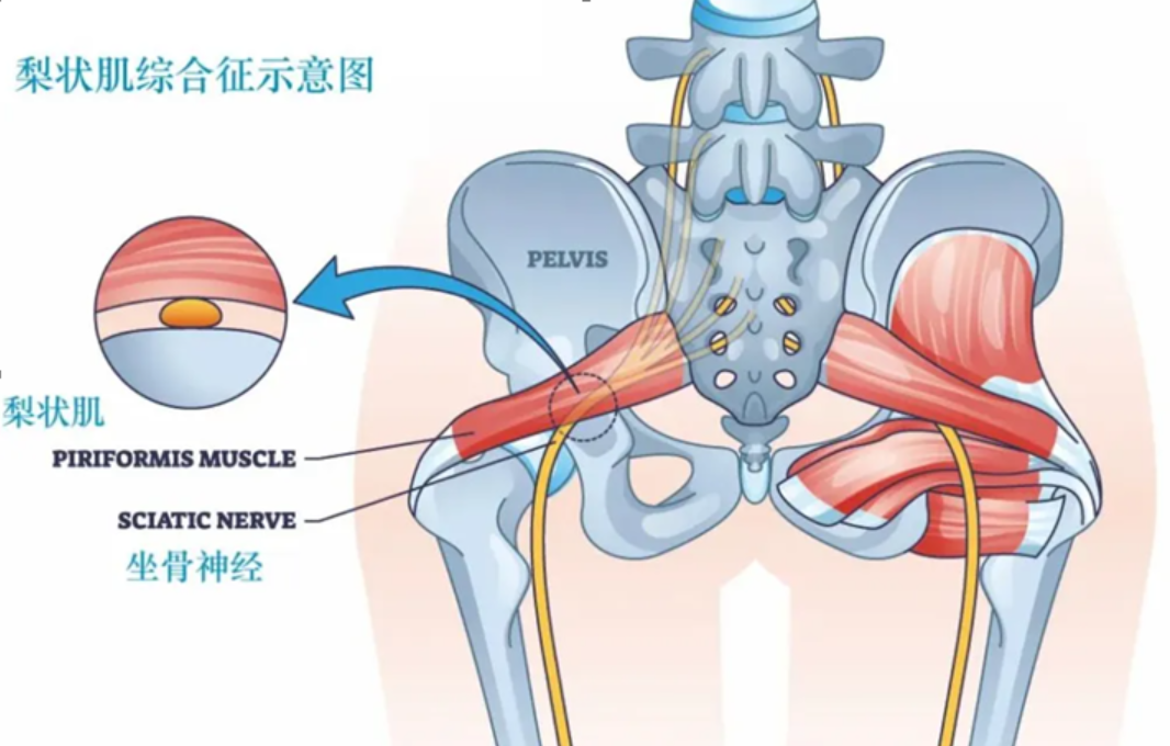 臀部深处有一块叫“梨状肌”的肌肉,久坐、翘二郎腿会让它紧张痉挛,而坐骨神经正好从它下方穿过 —— 肌肉一紧,就把神经“压到了”。