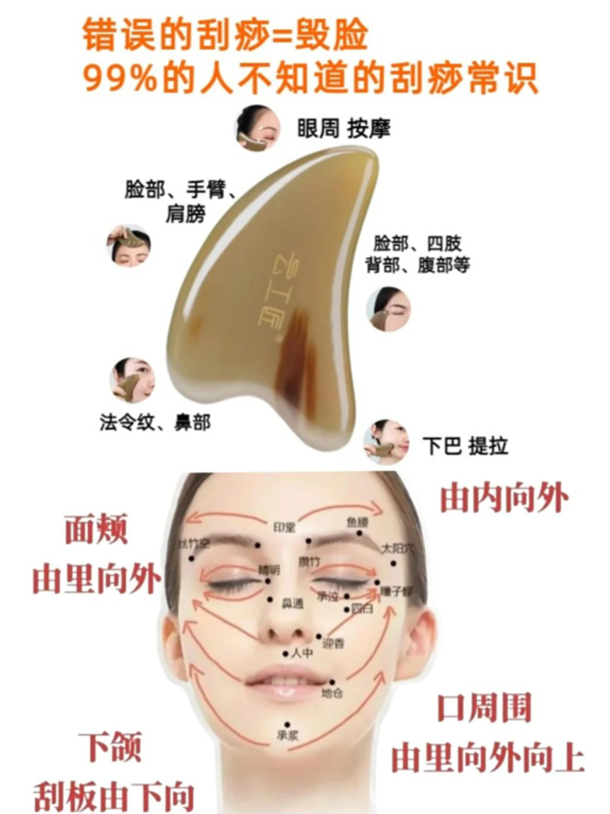 从中医的角度来看,面部是人体经络气血汇聚的部位,分布着众多的穴位和经络。通过使用特定的刮痧工具,在面部进行轻柔的刮拭,可以刺激这些穴位和经络,促进气血的运行。气血通畅了,面部肌肤就能得到更充足的营养供应,从而呈现出健康、红润的色泽。