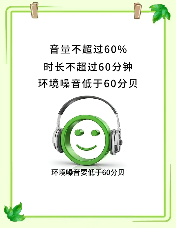 1.控制耳机使用:每次连续佩戴不超60分钟,音量调至最大音量的60%以下,优先选头戴式耳机。