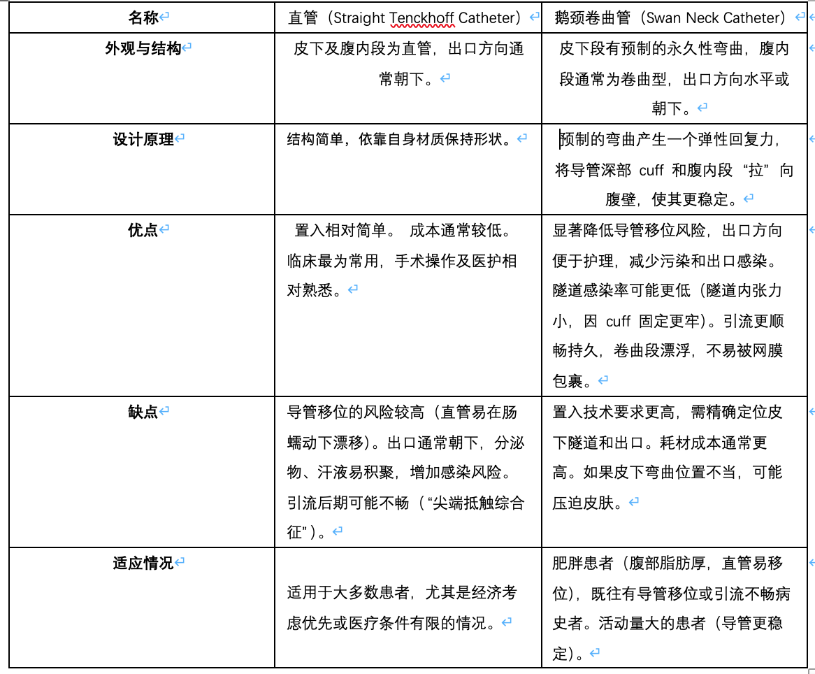 腹透导管是腹透患者的“生命线”,以往我们更关注的是皮下隧道、导管出口、液体出入通畅情况等,今天,我们就来简单聊一聊腹膜透析导管不同形状的不同学问!选择合适的类型对透析效果和并发症预防至关重要。了解它,是为了更好地保护它,陪伴我们更长久、更安全地进行居家透析治疗。一般来说,临床常用的有直管和鹅颈卷曲管,下面将从多个角度详细对比两者的区别,首先是两幅图片。