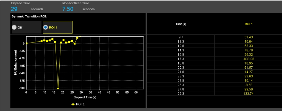 在应用间接法-智能追踪扫描方式时,如果留置针位置选择不当,可能会出现大部分对比剂未能第一时间参与灌注,导致在肺循环中对比剂与血液比例远低于正常值,即便达到靶血管的阈值,而感兴趣区CT值仍然过低,影响诊断。