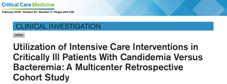 参考文献:North Jones M, Nigo M, Casarin S, et al. Utilization of intensive care interventions in critically ill patients with candidemia versus bacteremia: a multicenter retrospective cohort study. Crit Care Med. 2026;54(2):246-256. doi:10.1097/CCM.0000000000006963