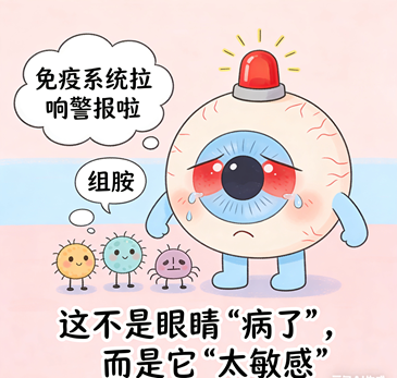 简单来说,这不是眼睛“病了”,而是它“太敏感”。 当花粉、尘螨等无害物质进入眼睛,您的免疫系统将其会误判为“敌人”,立刻拉响警报,释放大量“组胺”等物质,从而引发痒、红、肿等一系列反应,这就像身体的守卫在攻击“假想敌”。因此,这个病的根源在于个人的过敏体质,常与过敏性鼻炎、皮肤湿疹等问题结伴出现。