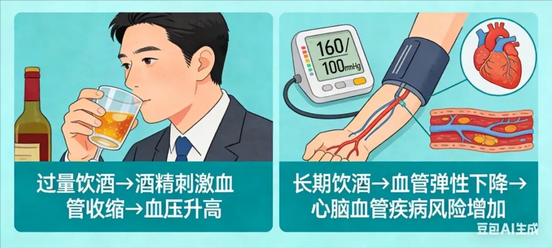 4.长期饮酒更会造成不可逆的伤害:酒精会损伤血管内皮细胞,加速动脉粥样硬化进程,使血管弹性下降、阻力增加,最终导致血压持续升高,发展为“酒精性高血压”。